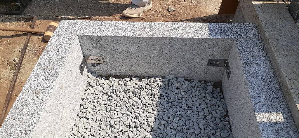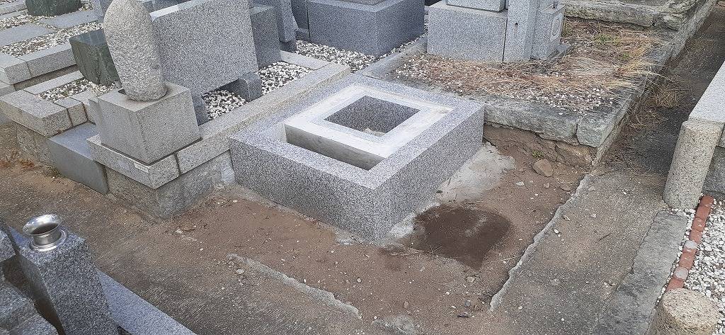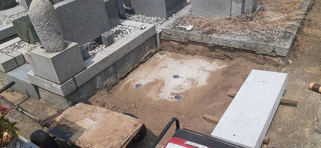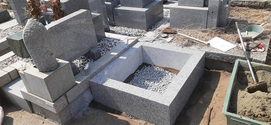 白御影石製の納骨所を組み立てコンクリートを流し、コンクリートが完全に乾いてから石碑の据え付けに移ります。