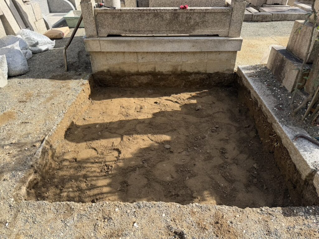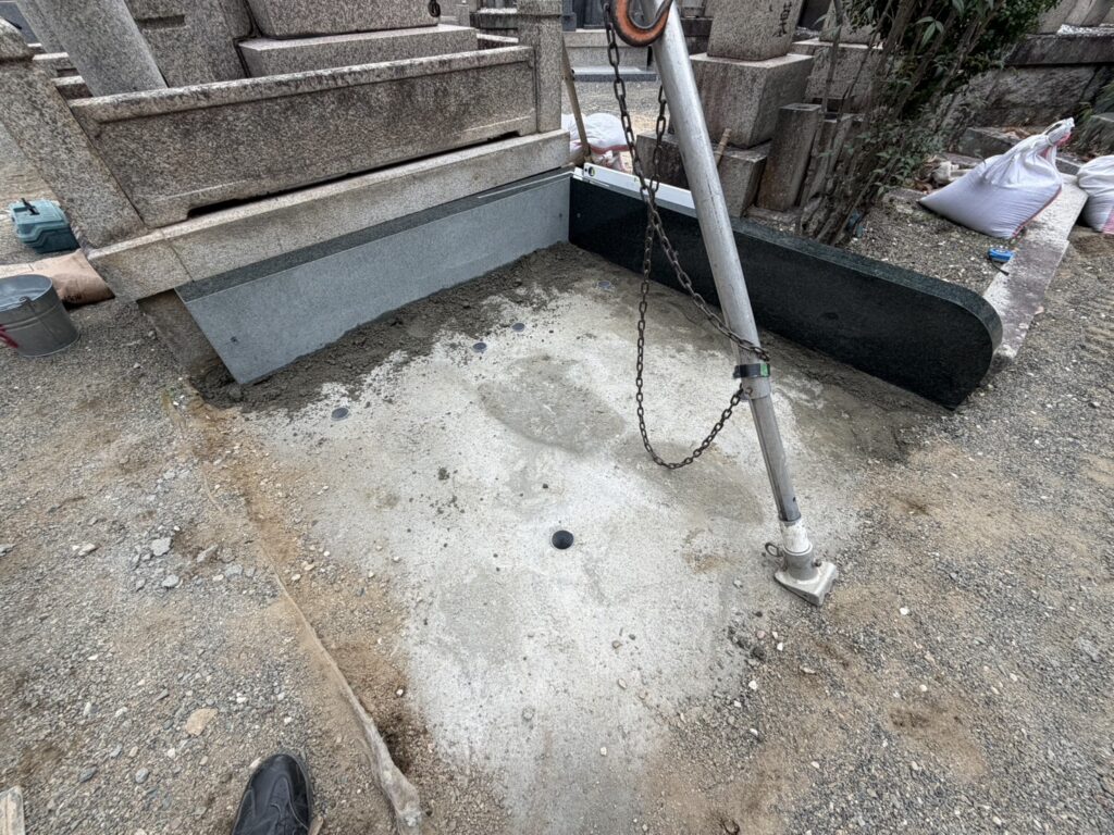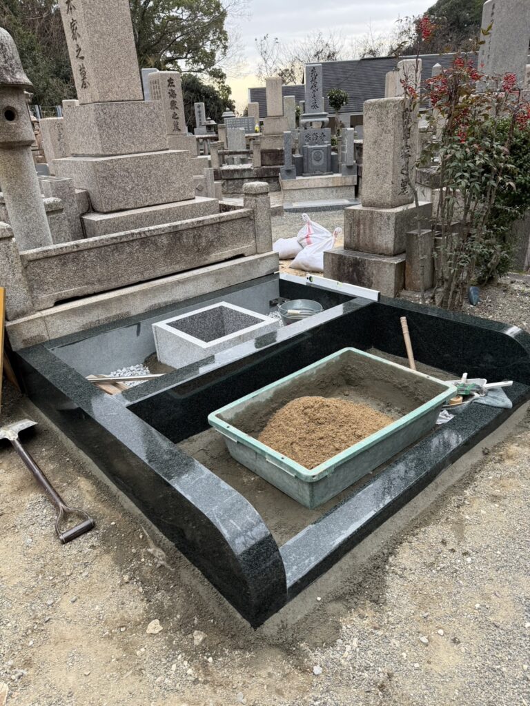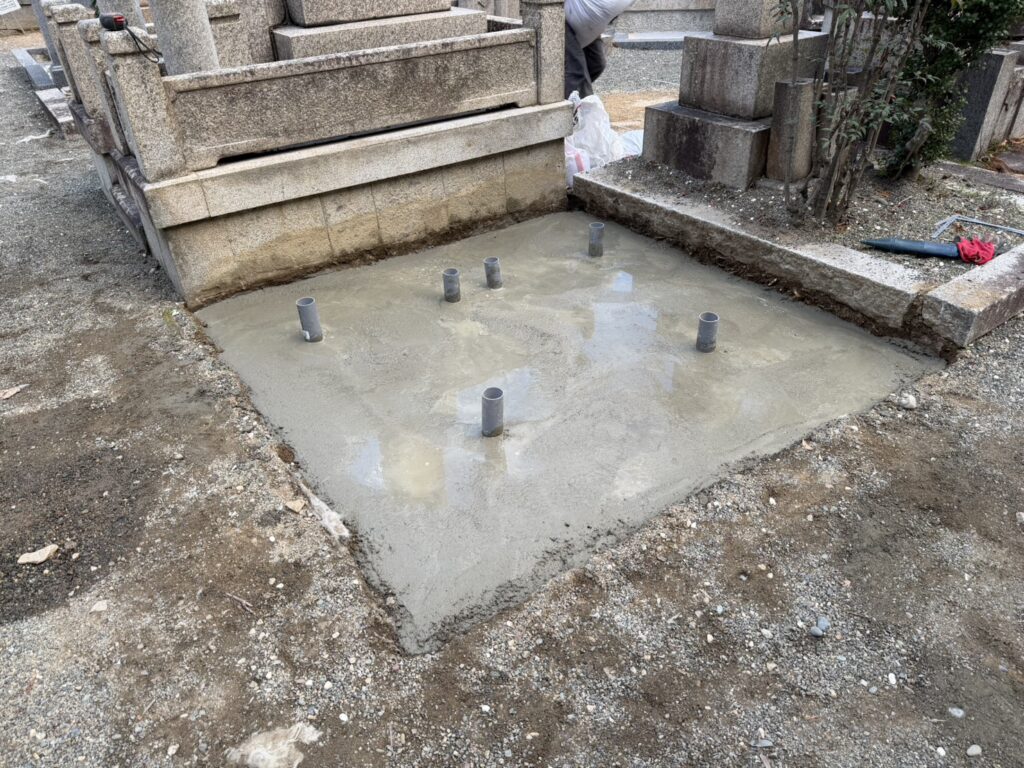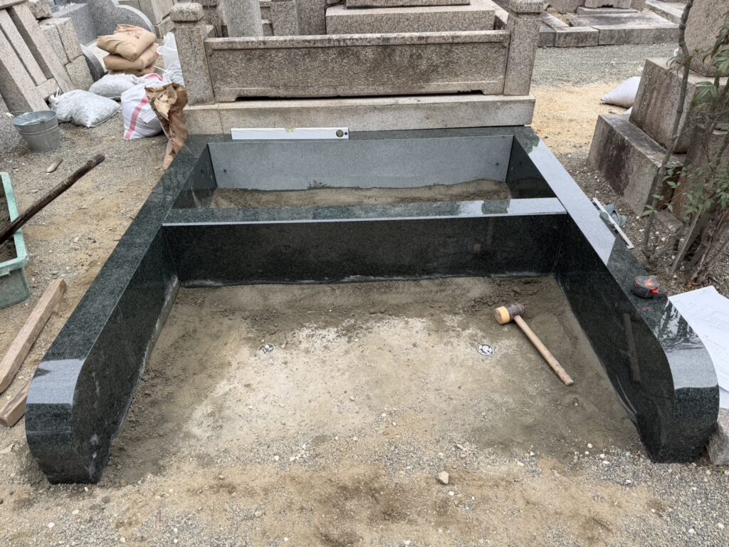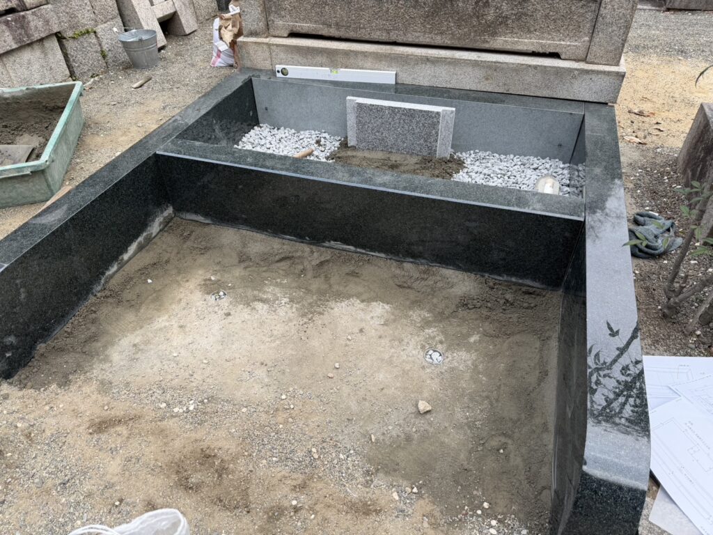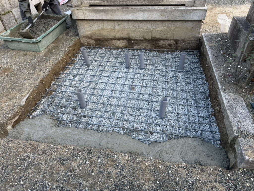 納骨所の設置が完了しましたので、お墓が載る部分の下にコンクリートを流し込みます。
