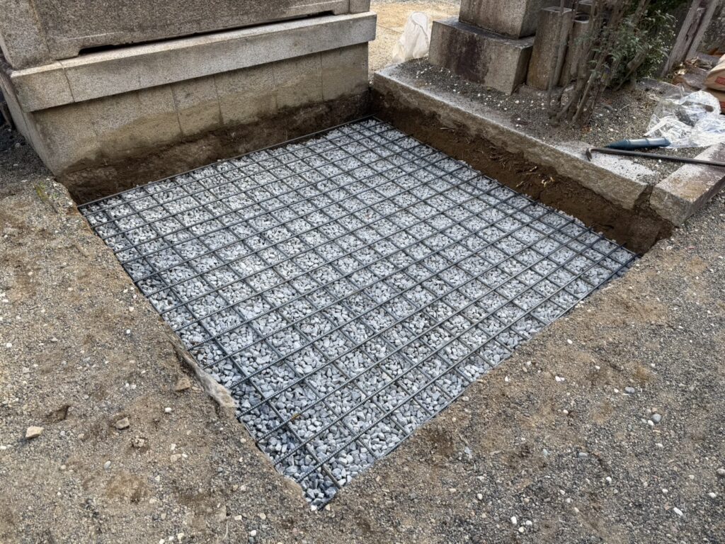 墓所内の土を取り除き砕石を入れ天圧を加え、鉄筋を組みます。