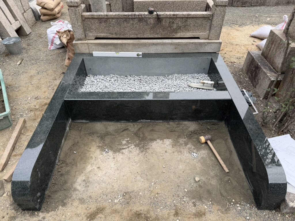 全ての巻石が据えれましたので、中に砕石を投入して納骨所を設置していきます。