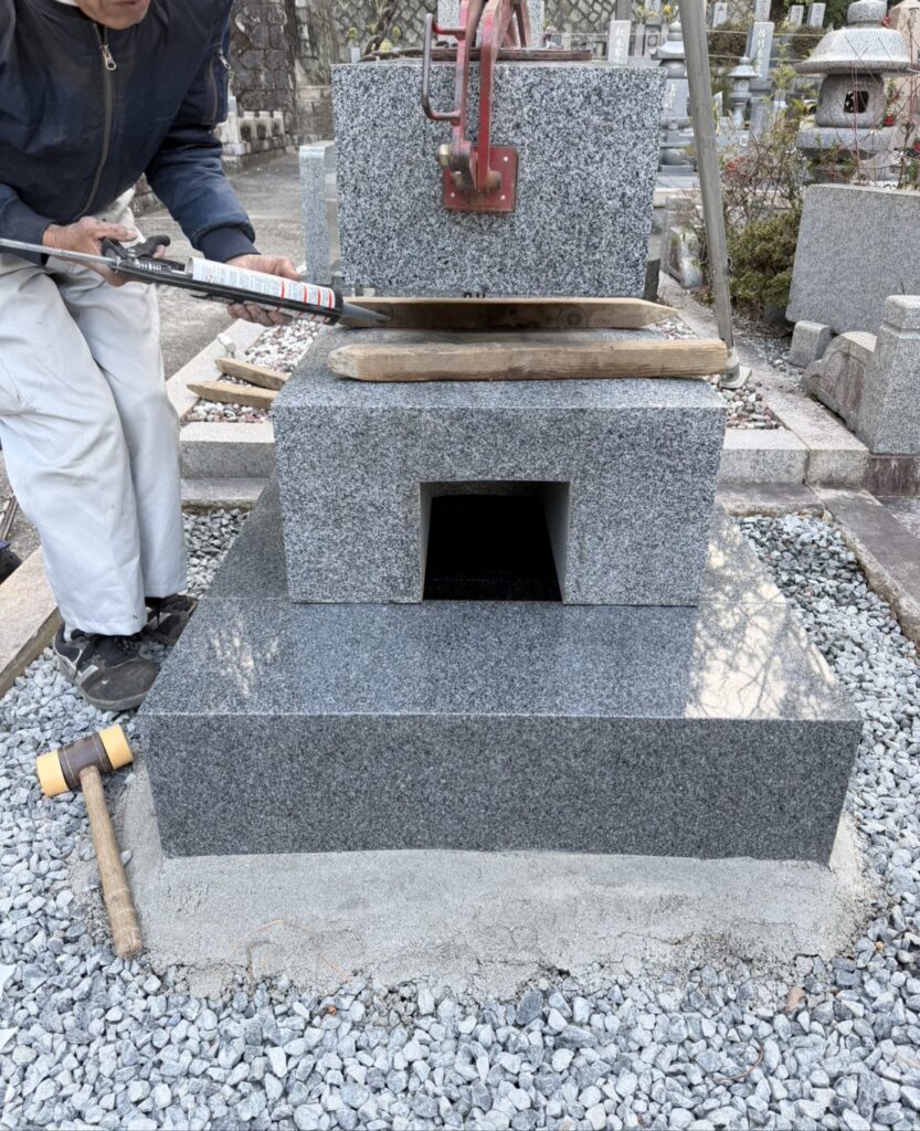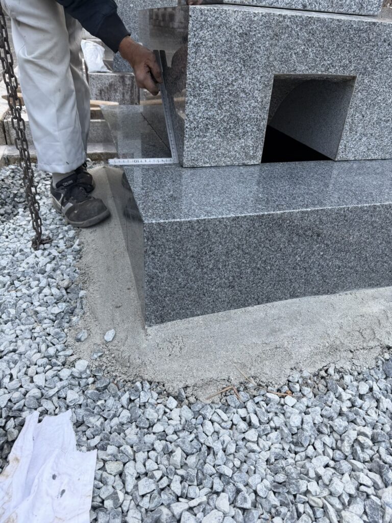 石材業界では乾く前に一気に建てる業者もおられますが、弊社は3重台の場合は敢えて四ツ石を据えましたら