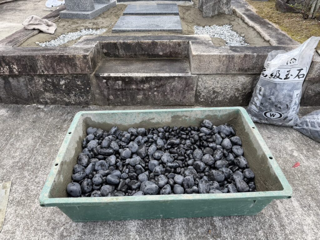 仕上げ砂利は高級黒玉石をお施主様のご希望で大小を7:3になるように混ぜて敷いていきます。